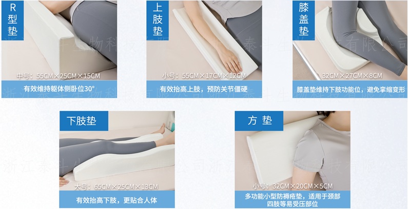 达到压力性损伤与关节畸形的双重预防,降低长期卧床导致的关节僵硬、腰部劳损风险,提升了产品的临床适用性。泰斗生产的R型垫、下肢垫、上肢垫、膝盖垫、方垫等五垫协同产品,以及约束手套、三防隔尿垫等护理用具,此前已在温医大附二院临床使用多年,获得医护人员一致认可。