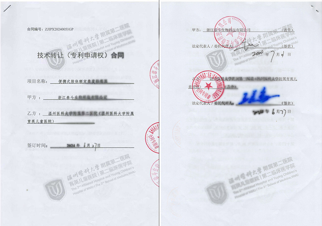 2024年6月,浙江泰斗生物科技有限公司与温州医科大学附属第二医院正式签署专利成果转化合同。这是泰斗首次与三甲医院达成专利成果转化合作,标志着公司在“医工结合”领域迈出关键一步,也开启了温医大附二院护理创新成果转化的新篇章。